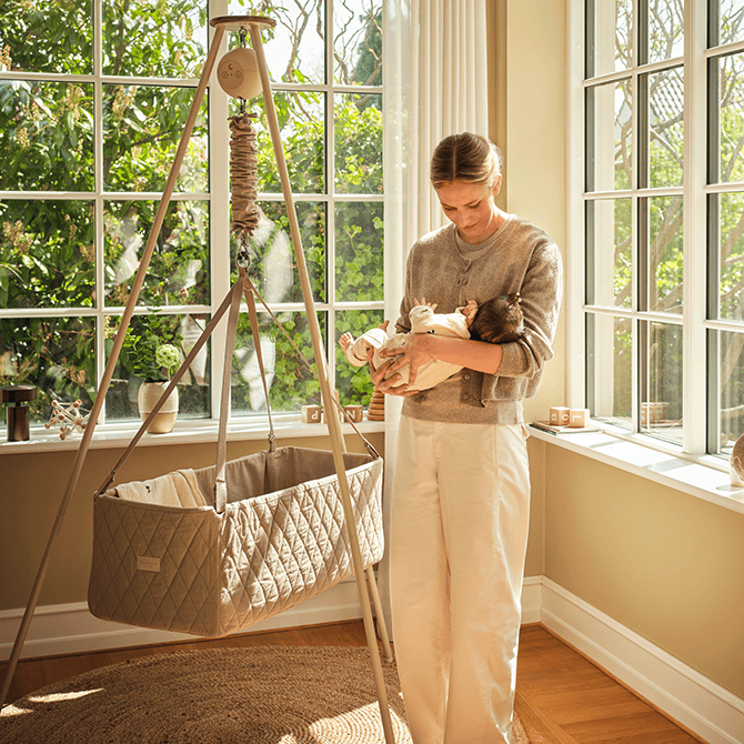 Rocking should be introduced gently and slowly – either manually or with our Moonboon Motor. You can gradually increase the tempo and duration of rocking as your baby gets used to it. You’ll soon learn what works for you.