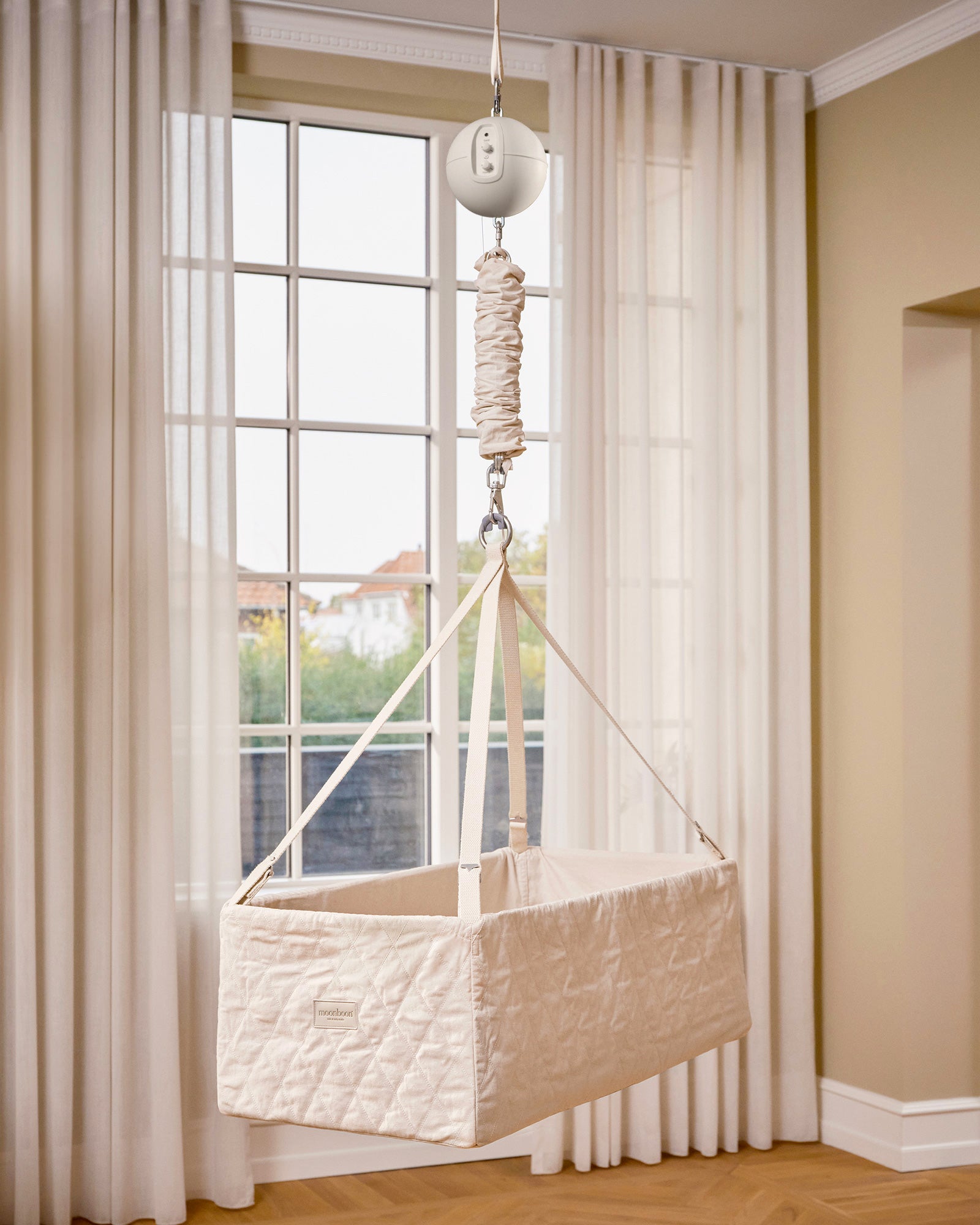 The cradle is made from high-quality materials including GOTS-certified organic cotton and our quiet motors are developed and safety tested rigorously by danish engineers.
