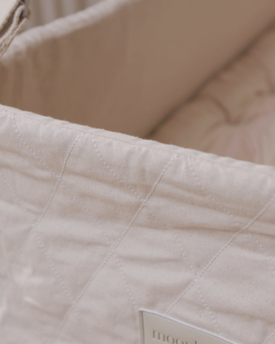 1 x GOTS-certified cradle with a quilted cover in a harlequin design of 100% organic cotton canvas. The quilt is made from 100% organic cotton padding.